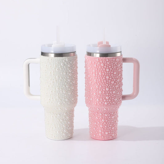 40oz H2.0 White Pink Rhinestone Pearl Bling Tumblers-CNLCA