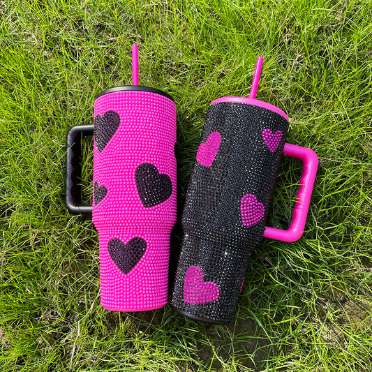 Hot Pink Black 40oz Sweet Heart Print Diamond Rhinestone Bling Stainless Steel Tumblers-CNLCA