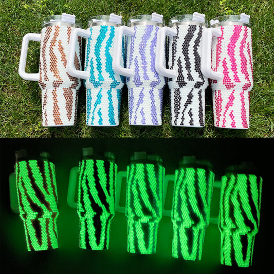40oz Glow In Dark Bling Zebra Pattern Rhinestone Full Coverd Travel Mug Tumbler With Handle Lid And Straw-USLCA